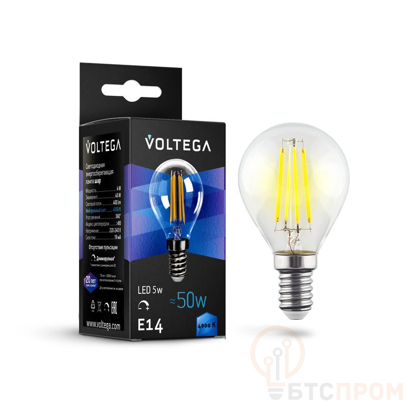 Светодиодная лампа Voltega 8465 Crystal. Форма Globe, 5Вт. Нейтральный белый свет 4000K. Цоколь E14. Диммируемая. Сферическая форма обеспечивает широкий угол рассеивания. Для люстр и подвесных светильников.