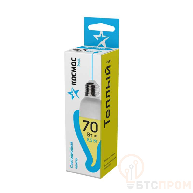 Светодиодная лампа КОСМОС LkecLED8.5wCWE2730. Мощность 8.5Вт. Напряжение 220В. Цоколь E27. Теплый белый свет 3000K. Компактные размеры и высокая эффективность. Идеальна для замены ламп накаливания 60Вт в стандартных светильниках.