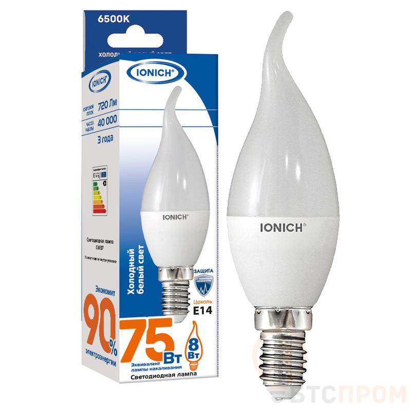 Лампа светодиодная IONICH 1639. Форма CW37 "Свеча на ветру", 8Вт. Холодный белый свет 6500K. Цоколь Е14. Напряжение 230В. Декоративная форма с холодным оттенком света. Создает современную атмосферу в интерьере. Для дизайнерских светильников и люстр.