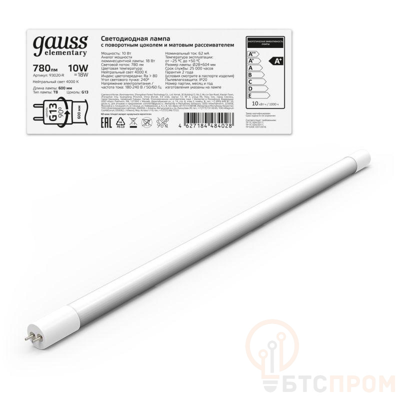 –Лампа светодиодная Elementary 10Вт трубчатая 4000К нейтр. бел. G13 780лм стекло GAUSS 93020-R