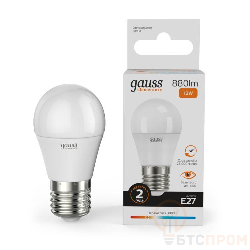 Лампа светодиодная Elementary 12Вт P45 шар 3000К тепл. бел. E27 880лм GAUSS 53212 фото в каталоге от BTSprom.by