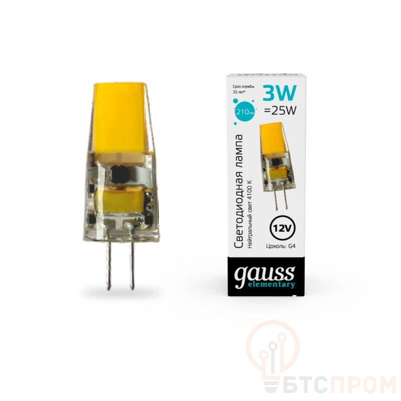 Лампа светодиодная GAUSS 18723 Elementary. Капсульная, 3Вт. Нейтральный белый свет 4100K. Цоколь G4. Световой поток 250 лм. Напряжение 12В. Для низковольтных систем освещения. Безопасность и эффективность.