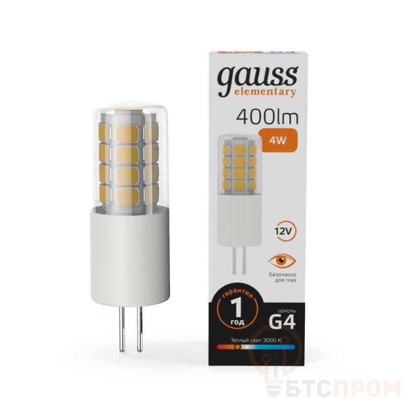 Светодиодная лампа GAUSS 10714 Elementary. Капсульная, 4Вт. Теплый белый свет 3000K. Цоколь G4. Световой поток 400 лм. Напряжение 12В. Увеличенная яркость для акцентной подсветки. Подходит для витрин и экспозиций.
