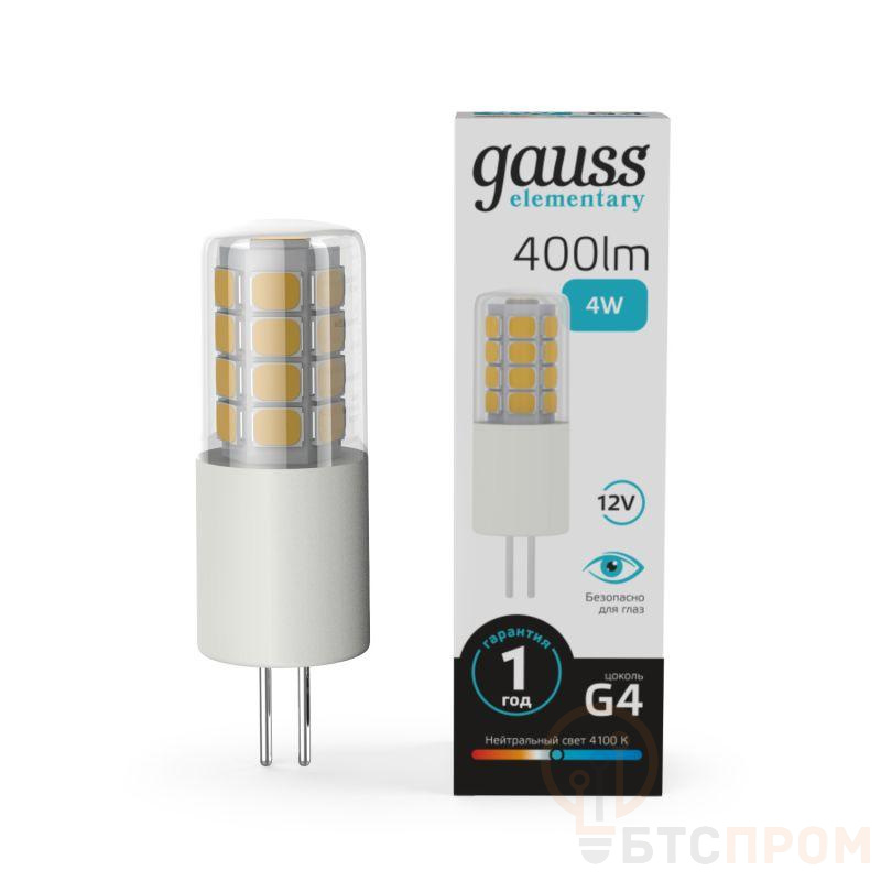 Лампа светодиодная GAUSS 10724 Elementary. Капсульная, 4Вт. Нейтральный белый свет 4100K. Цоколь G4. Световой поток 400 лм. Напряжение 12В. Качественное освещение с точной цветопередачей. Для магазинов и выставочных пространств.