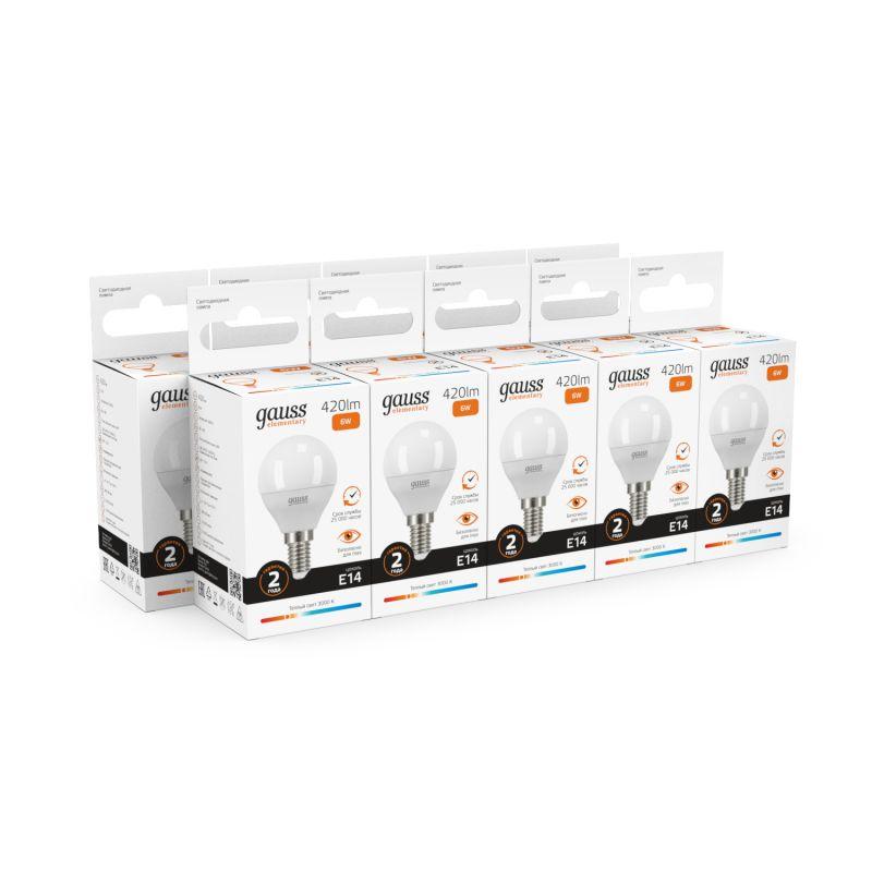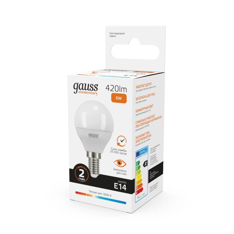<p>Светодиодная лампа GAUSS Elementary мощностью 6Вт — это современная энергоэффективная замена традиционным лампам накаливания. Модель с цоколем E14 и формой P45 (шар) создает комфортное тепло-белое свечение 3000К, идеальное для создания уютной атмосферы в жилых помещениях.</p>