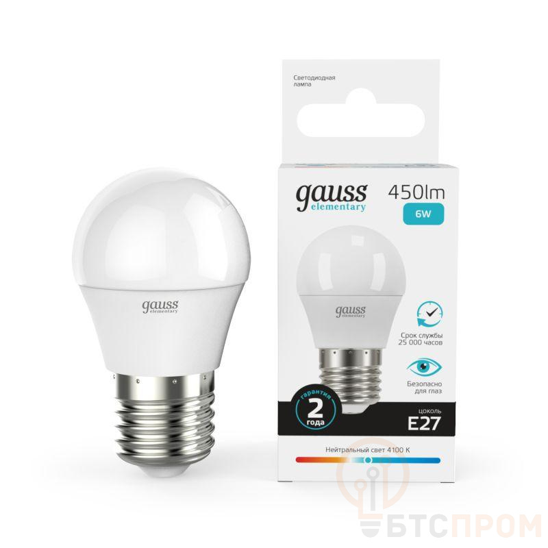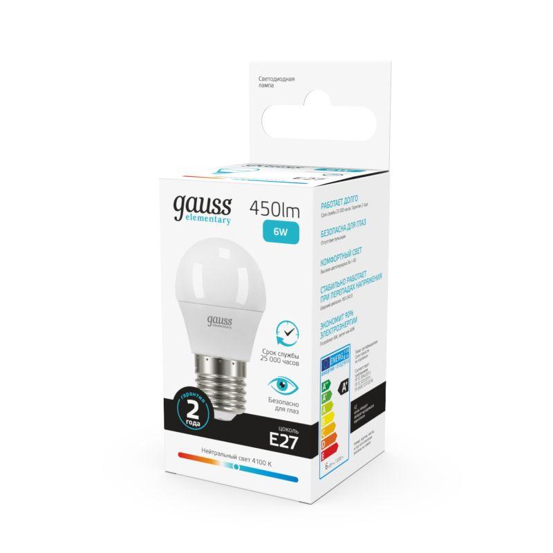 Лампа светодиодная LED Elementary Globe 6Вт E27 4100К Gauss 53226 – лампа с колбой вида "шар", белого света, длиной 87 мм, диаметром 45 мм, с цоколем Е27, мощностью 6 Вт. Цветовая температура 4100 К.