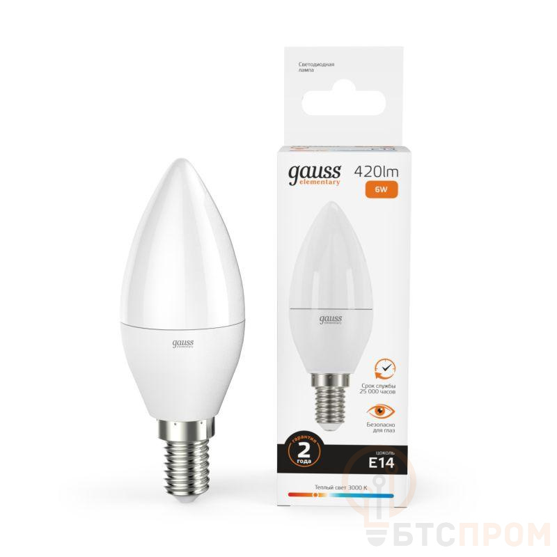Лампа светодиодная LED Elementary Candle 6Вт E14 2700К Gauss 33116 – лампа с колбой вида "свеча", желтого света, длиной 112 мм, диаметром 37 мм, с цоколем Е14, мощностью 6 Вт. Цветовая температура 2700 К.