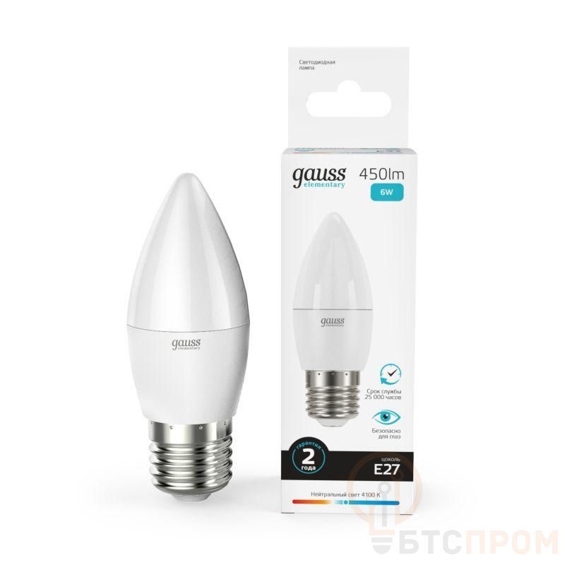 Лампа светодиодная LED Elementary Candle 6Вт E27 4100К Gauss 33226 – лампа с колбой вида "свеча", белого света, длиной 112 мм, диаметром 37 мм, с цоколем Е27, мощностью 6 Вт. Цветовая температура 4100 К.