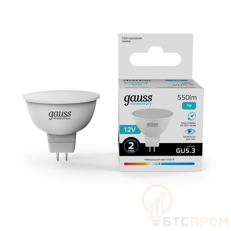 Лампа светодиодная GAUSS 11527 Elementary. MR16 софит, 7Вт. Нейтральный белый свет 4100K. Цоколь GU5.3. Световой поток 550 лм. Напряжение 12В. Четкое освещение с хорошей цветопередачей. Для рабочих поверхностей и коммерческих помещений.