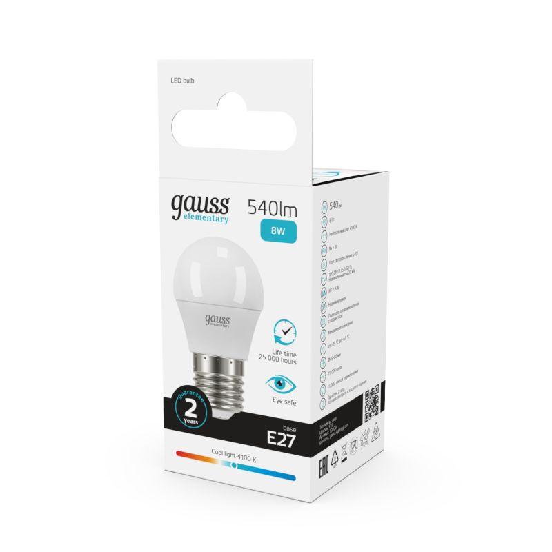 –Лампа светодиодная Elementary 8Вт P45 шар 4100К нейтр. бел. E27 540лм GAUSS 53228