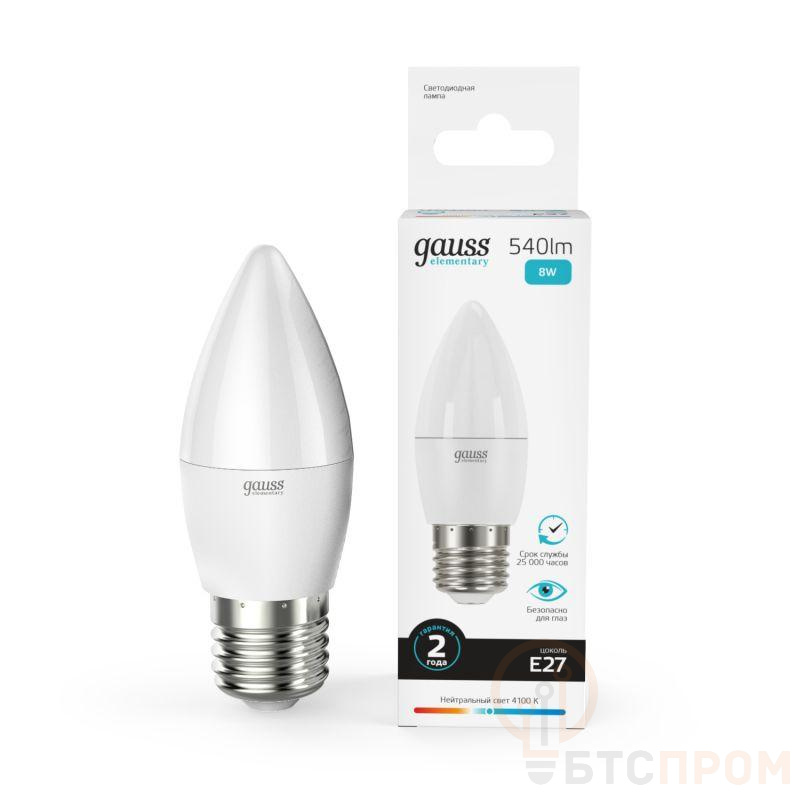 –Лампа светодиодная Elementary 8Вт свеча 4100К нейтр. бел. E27 540лм GAUSS 33228
