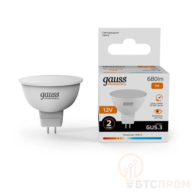 Светодиодная лампа GAUSS 11519 Elementary. MR16 софит, 9Вт. Теплый белый свет 3000K. Цоколь GU5.3. Световой поток 680 лм. Напряжение 12В. Мощная акцентная подсветка. Создает яркие световые акценты в интерьере.