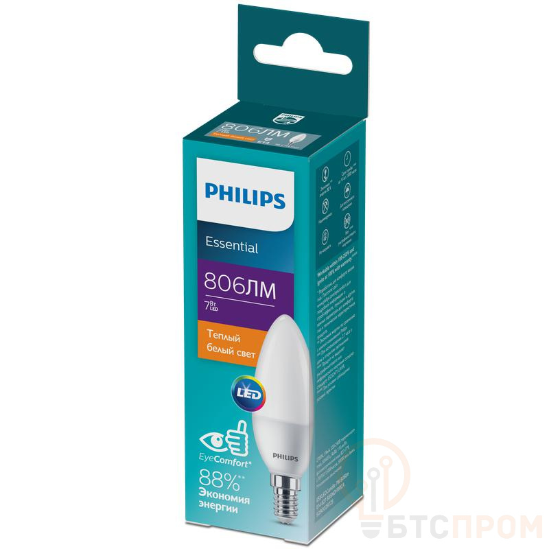 Лампа светодиодная PHILIPS 929002972507 ESS LEDCandle. Мощность 7Вт. Форма B38FR. Световой поток 806 лм. Цоколь E14. Теплый белый свет 2700K (827). Увеличенная мощность для более яркого освещения. Подходит для больших люстр.