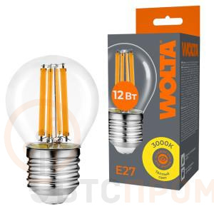 Ключевые характеристики: цоколь E27, мощность 12Вт, световой поток 1050 люмен, теплая цветовая температура 3000К (теплый белый). Прозрачная стеклянная колба формы G45 («шар») идеально демонстрирует уникальную конструкцию светодиодных нитей, создавая уютную атмосферу.
