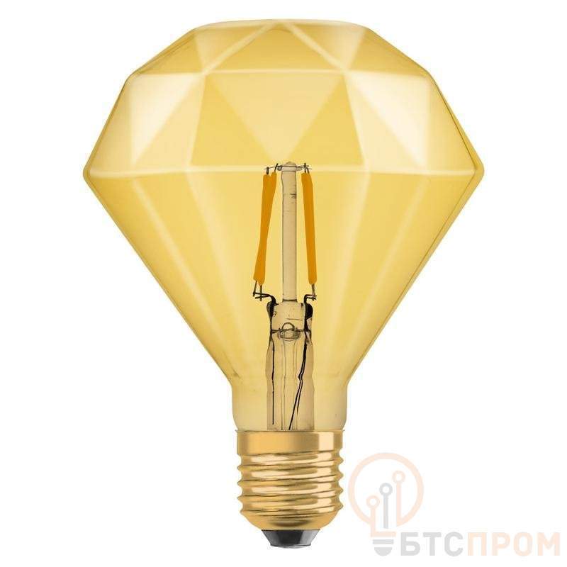 Лампа светодиодная филаментная OSRAM Vintage 1906 LED CL DIAMOND FIL GOLD 40 non-dim 4,5W/825 E27, 470 лм, 4,5Вт (замена 40Вт), 2500К (теплый белый свет). Цоколь E27, колба Deco. Исполнение колбы золотистое, стекло. Напряжение питания 220-240В. Товар сертифицирован.