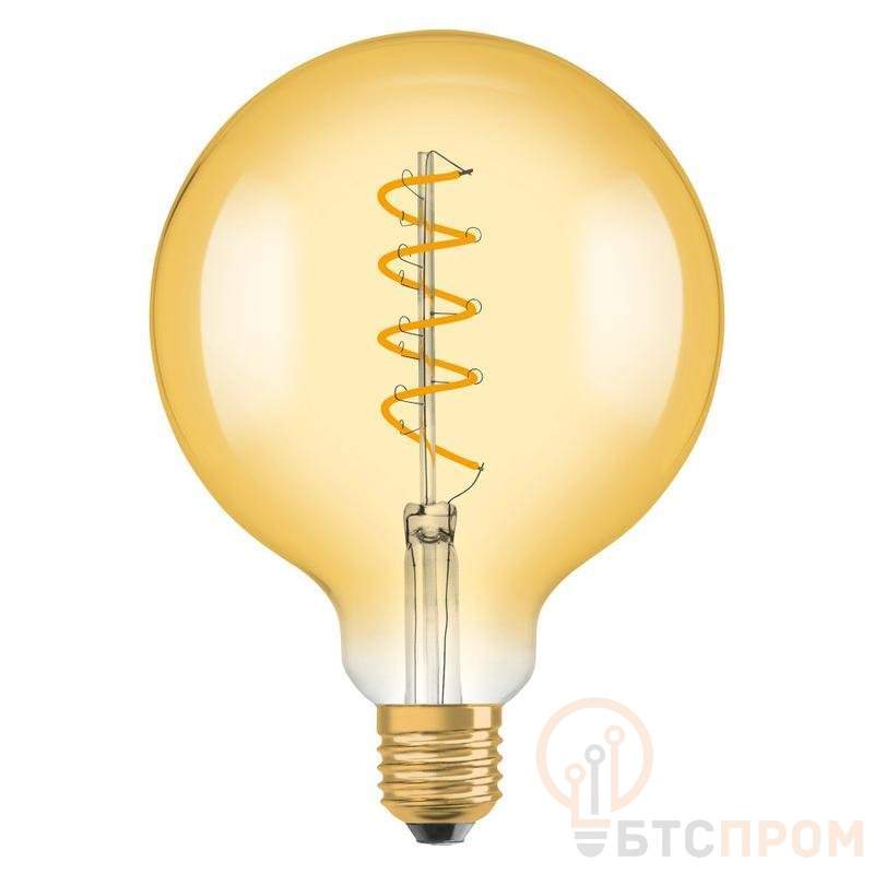 Лампа светодиодная филаментная OSRAM Vintage 1906 LED CL GLOBE125 FIL GOLD 25 non-dim 5W/820 E27, 250 лм, 5Вт (замена 25Вт), 2000К (теплый белый свет). Цоколь E27, колба Deco. Исполнение колбы золотистое, стекло. Напряжение питания 220-240В. Товар сертифицирован.