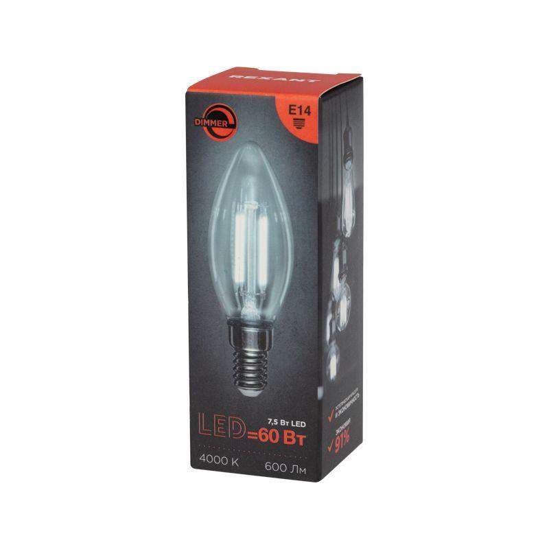 Филаментная лампа Rexant. Мощность 7.5 Вт. Форма CN35 (свеча). Прозрачная колба. Нейтральный свет 4000К. Цоколь E14. Поток 600 лм. Диммируемая. Для регулировки яркости в люстрах и бра.