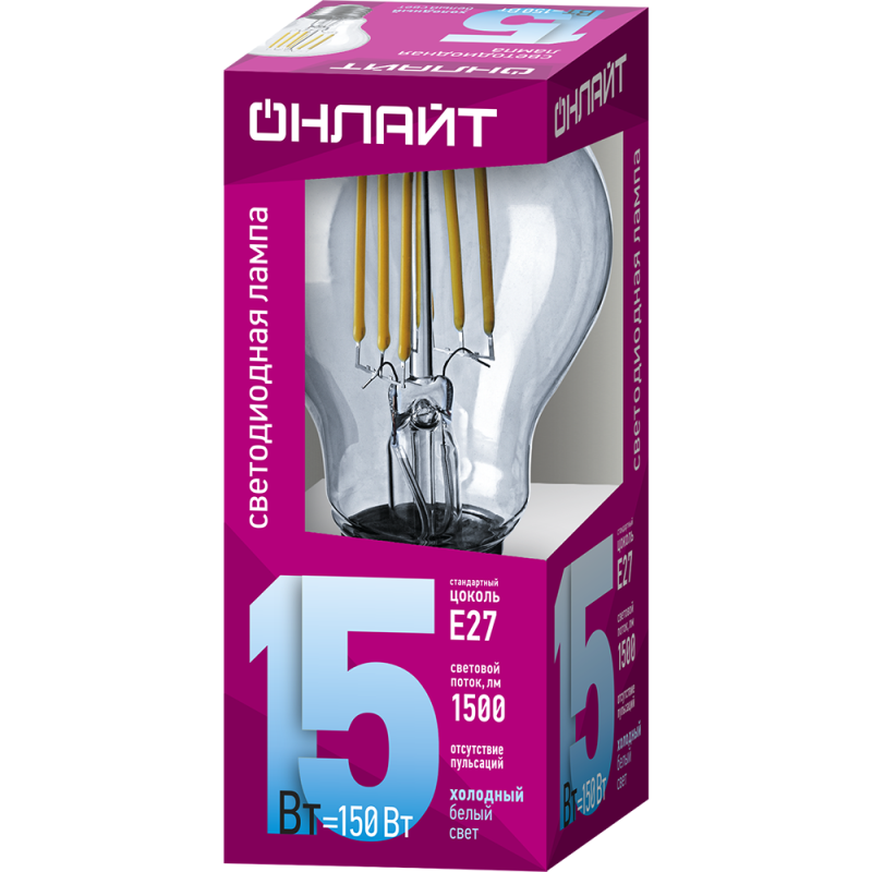 Филаментная лампа ОНЛАЙТ. Форма A60. Мощность 15 Вт. Прозрачная колба. Нейтральный свет 4000К. Цоколь E27. Поток 1500 лм.