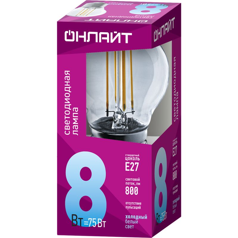 Филаментная лампа ОНЛАЙТ. Форма G45. Мощность 8 Вт. Прозрачная колба. Нейтральный свет 4000К. Цоколь E27. Поток 800 лм.