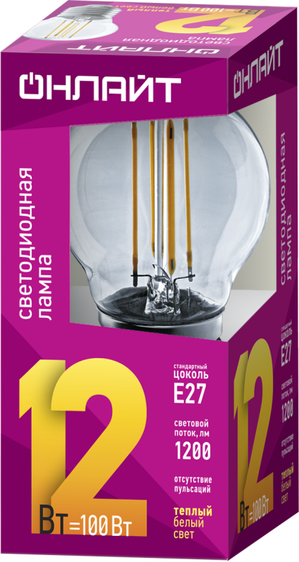 Филаментная лампа ОНЛАЙТ. Форма G45. Мощность 12 Вт. Прозрачная колба. Теплый свет 2700К. Цоколь E27. Поток 1200 лм.
