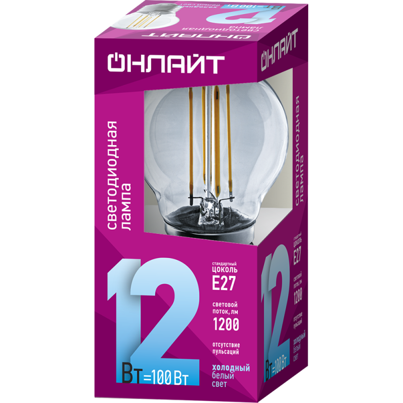 Филаментная лампа ОНЛАЙТ. Форма G45. Мощность 12 Вт. Прозрачная колба. Нейтральный свет 4000К. Цоколь E27. Поток 1200 лм.