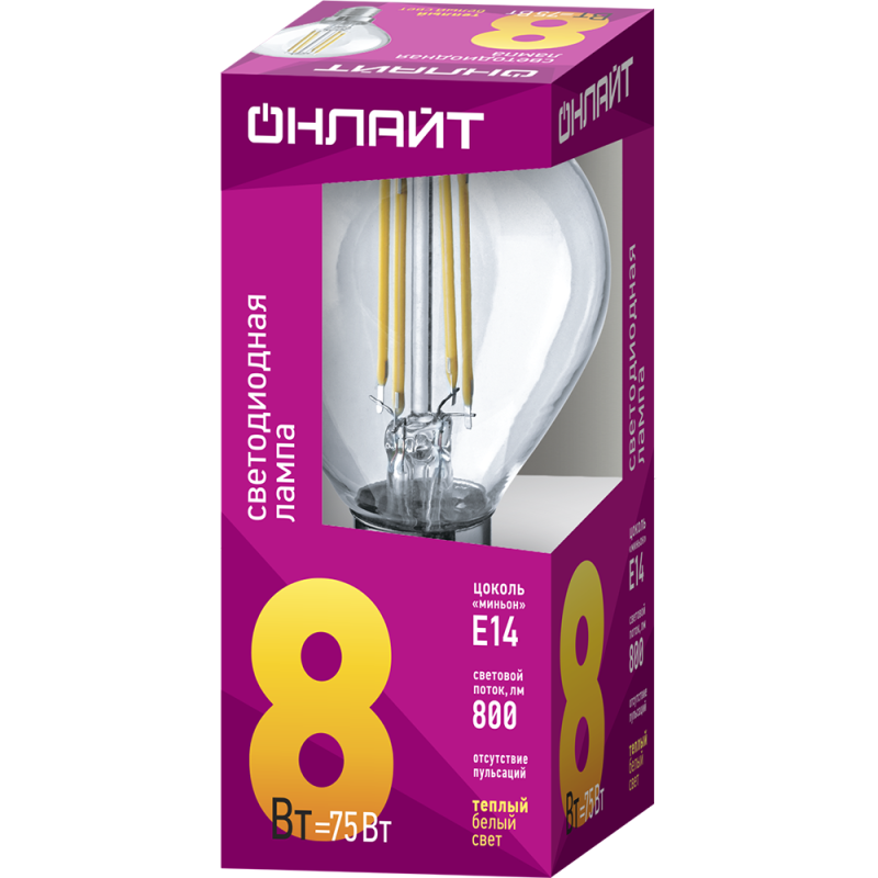 Филаментная лампа ОНЛАЙТ. Форма G45. Мощность 8 Вт. Прозрачная колба. Теплый свет 2700К. Цоколь E14. Поток 800 лм.