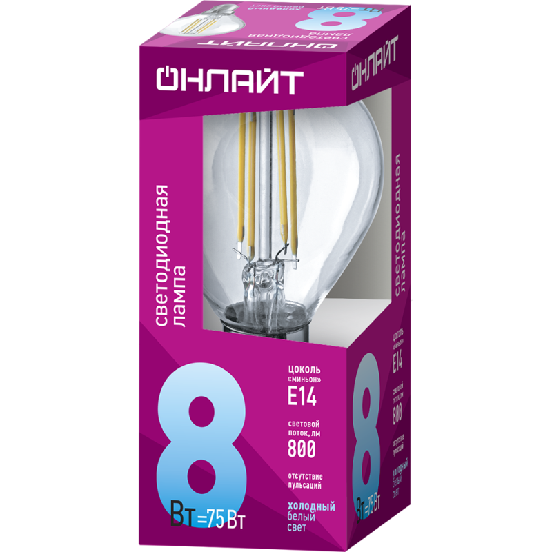 Филаментная лампа ОНЛАЙТ. Форма G45. Мощность 8 Вт. Прозрачная колба. Нейтральный свет 4000К. Цоколь E14. Поток 800 лм.