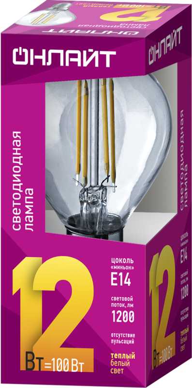 Филаментная лампа ОНЛАЙТ. Форма G45. Мощность 12 Вт. Прозрачная колба. Теплый свет 2700К. Цоколь E14. Поток 1200 лм.
