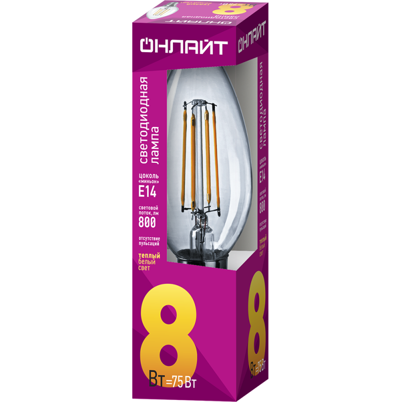 Филаментная лампа ОНЛАЙТ. Форма C35. Мощность 8 Вт. Прозрачная колба. Теплый свет 2700К. Цоколь E14. Поток 800 лм.