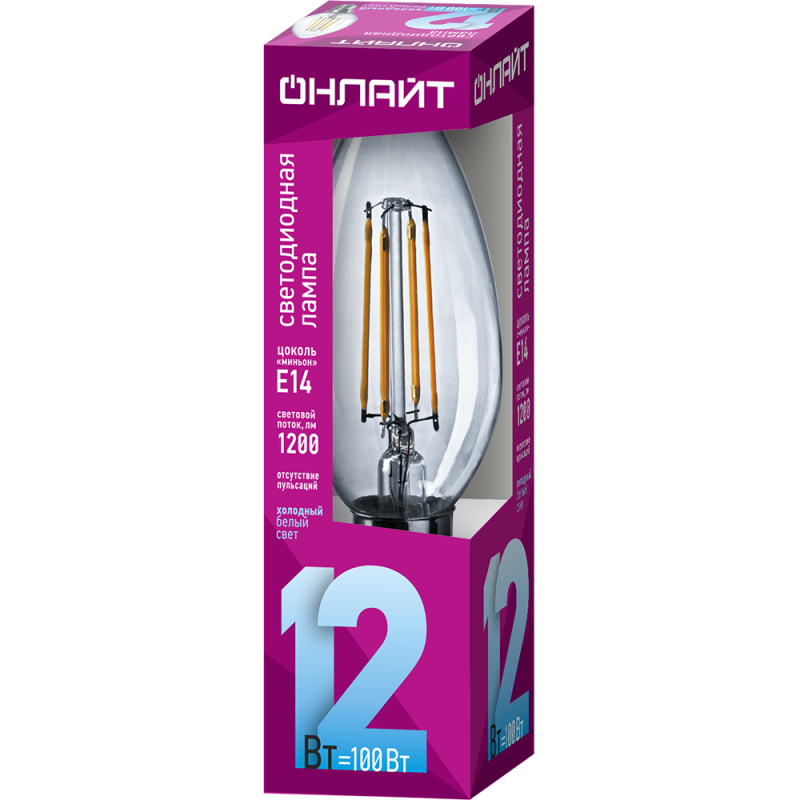 Филаментная лампа ОНЛАЙТ. Форма C35. Мощность 12 Вт. Прозрачная колба. Нейтральный свет 4000К. Цоколь E14. Поток 1200 лм.