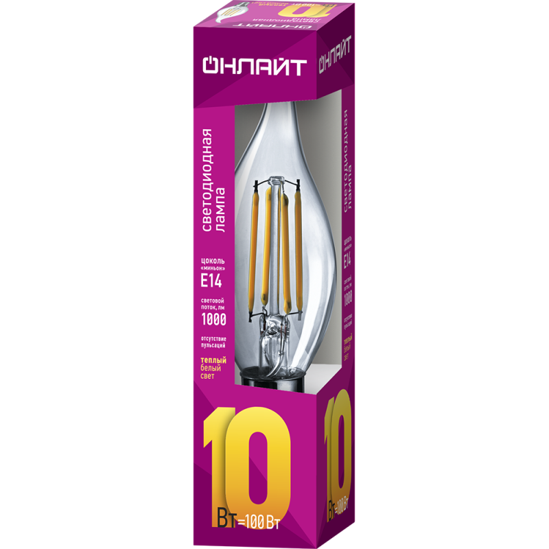 Филаментная лампа ОНЛАЙТ. Форма FC35. Мощность 10 Вт. Прозрачная колба. Теплый свет 2700К. Цоколь E14. Поток 1000 лм.