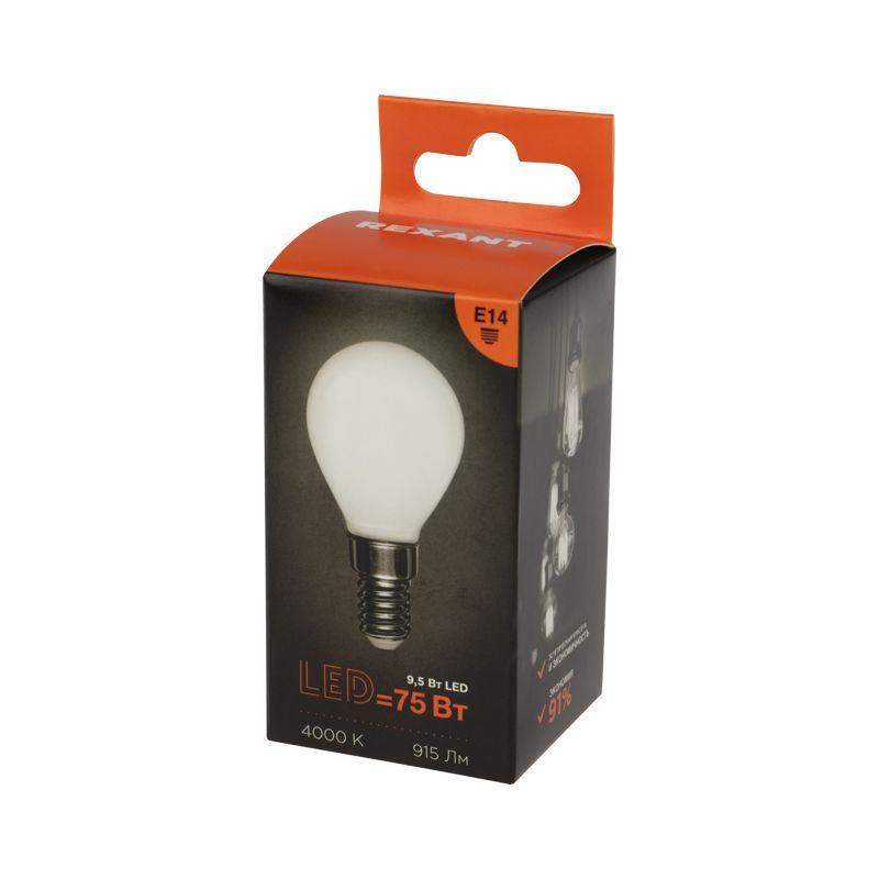 Филаментная лампа Rexant. Мощность 9.5 Вт. Форма GL45. Матовая колба. Нейтральный свет 4000К. Цоколь E14. Поток 915 лм.