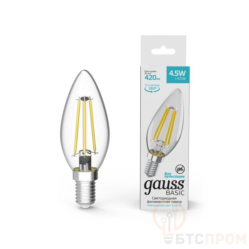 Лампа светодиодная филаментная Basic 4.5Вт свеча 4100К нейтр. бел. E14 420лм GAUSS 1031215 фото в каталоге от BTSprom.by