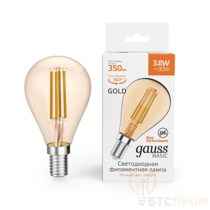Лампа светодиодная филаментная Basic Filament 3.8Вт Шар 2400К Е14 350лм golden GAUSS 1057154 фото в каталоге от BTSprom.by