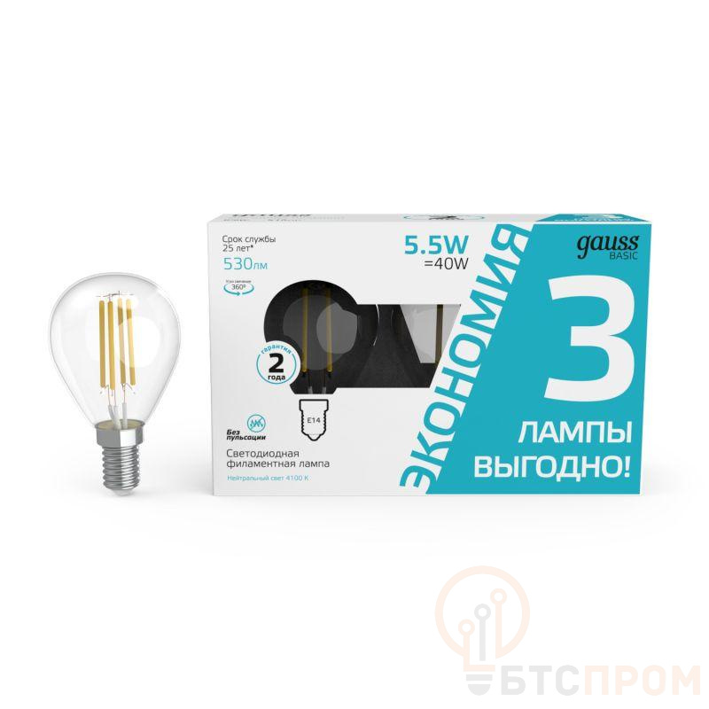 –Лампа светодиодная филаментная Basic Filament 5.5Вт шар 4100К Е14 530лм (уп.3шт) GAUSS 1051126T