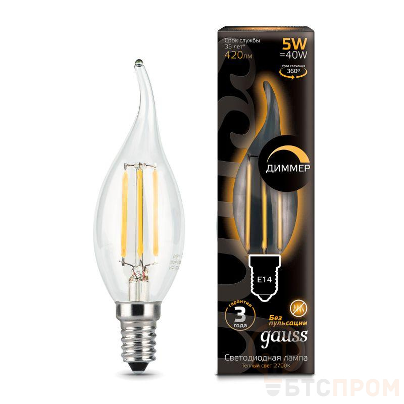 Лампа светодиодная филаментная Black Filament 5Вт свеча на ветру 2700К тепл. бел. E14 420лм диммир. GAUSS 104801105-D
