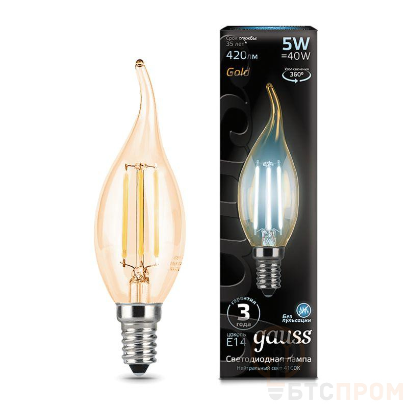 Лампа светодиодная филаментная Black Filament 5Вт свеча на ветру золотая 4100К нейтр. бел. E14 420лм GAUSS 104801805