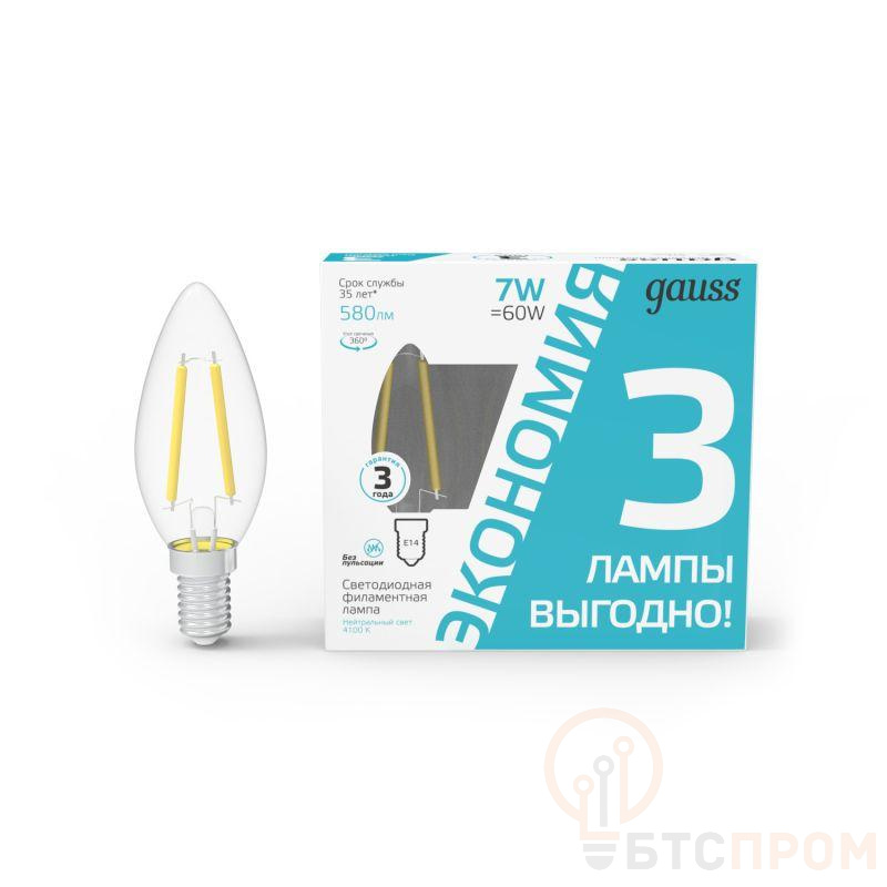 Лампа светодиодная филаментная Black Filament 7Вт свеча 4100К нейтр. бел. E14 580лм промо (уп.3шт) GAUSS 103901207T