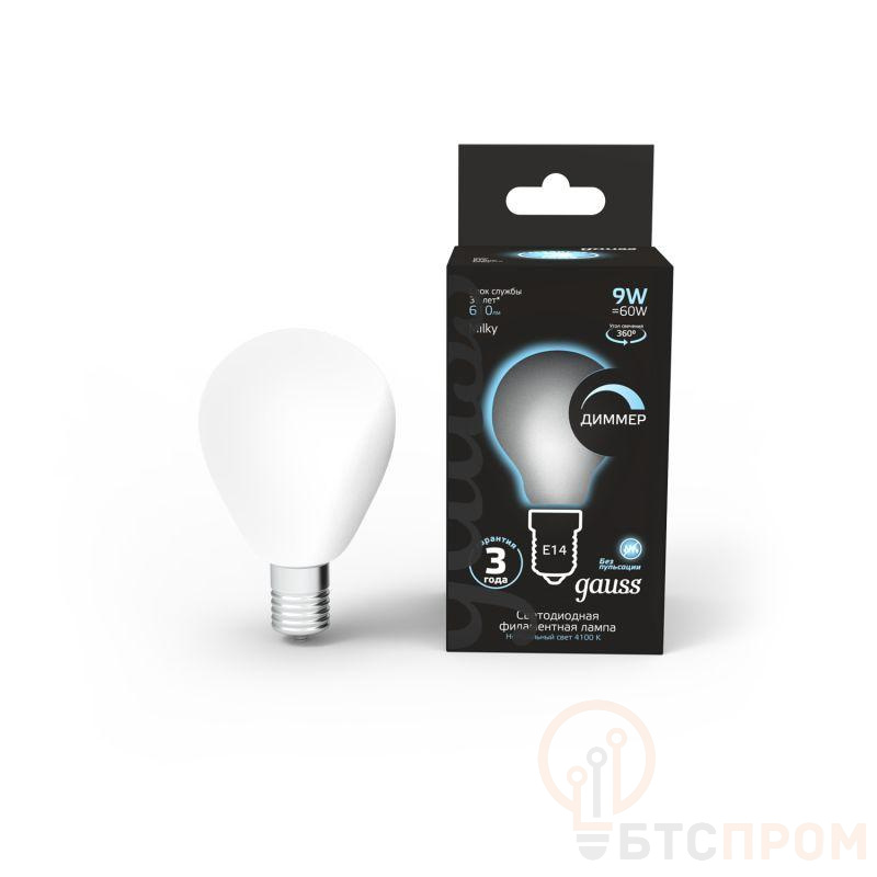 Лампа светодиодная филаментная Black Filament 9Вт P45 шар матовая 4100К нейтр. бел. E14 610лм диммир. GAUSS 105201209-D