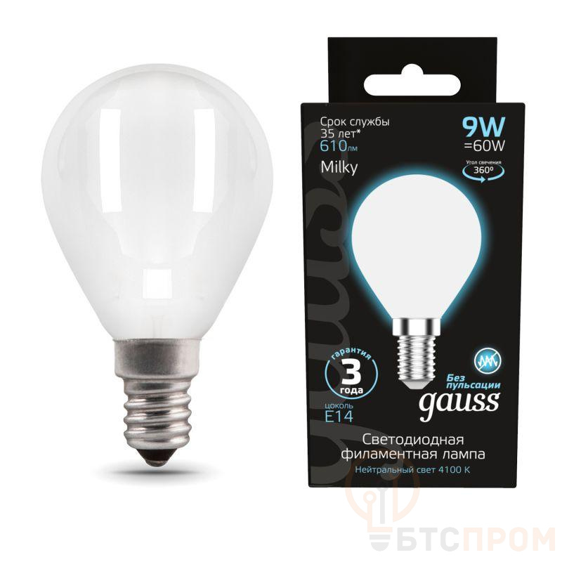 Лампа светодиодная филаментная Black Filament 9Вт P45 шар матовая 4100К нейтр. бел. E14 610лм GAUSS 105201209