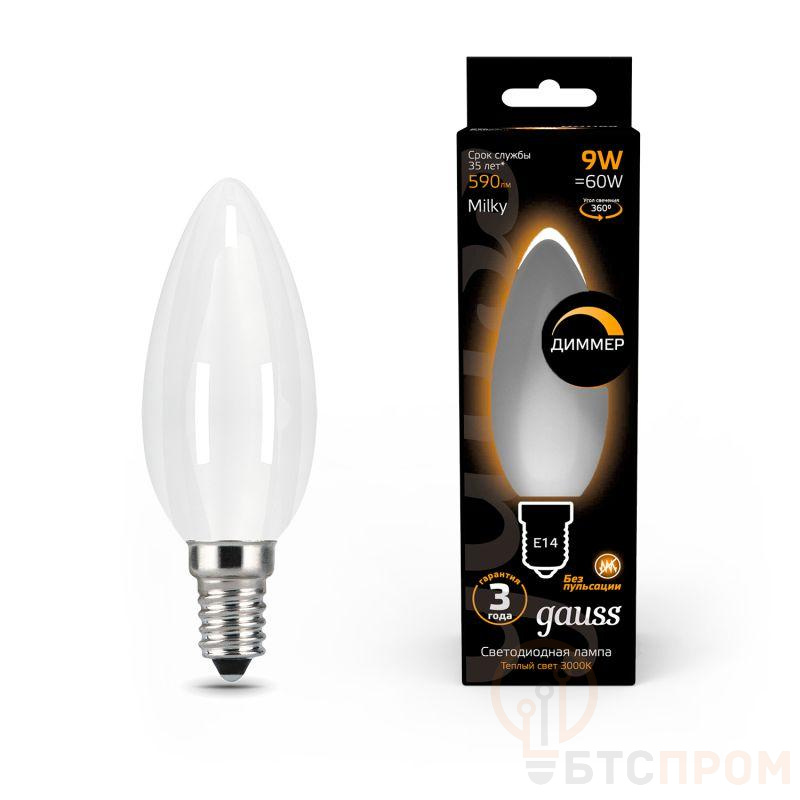 Лампа светодиодная филаментная Black Filament 9Вт свеча матовая 3000К тепл. бел. E14 590лм диммир. GAUSS 103201109-D