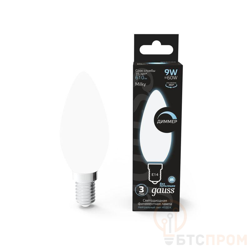 Лампа светодиодная филаментная Black Filament 9Вт свеча матовая 4100К нейтр. бел. E14 610лм диммир. GAUSS 103201209-D