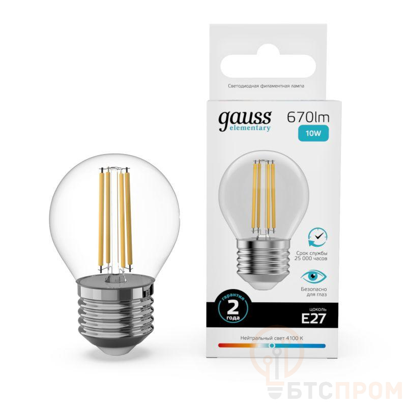 Лампа светодиодная филаментная Filament Elementary 10Вт шар 4100К Е27 670лм GAUSS 52220 фото в каталоге от BTSprom.by