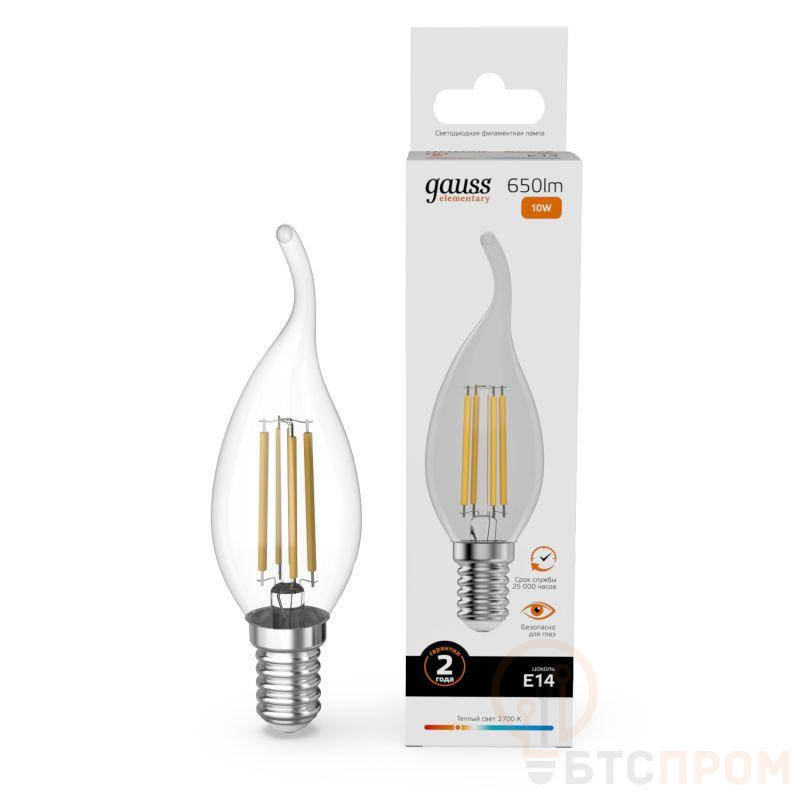 Лампа светодиодная филаментная Filament Elementary 10Вт свеча на ветру 2700К Е14 650лм GAUSS 42110 фото в каталоге от BTSprom.by