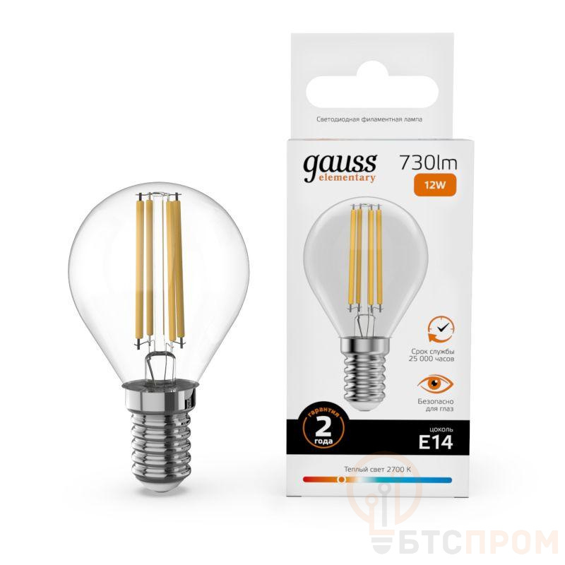 Лампа светодиодная филаментная Filament Elementary 12Вт шар 2700К Е14 730лм GAUSS 52112 фото в каталоге от BTSprom.by