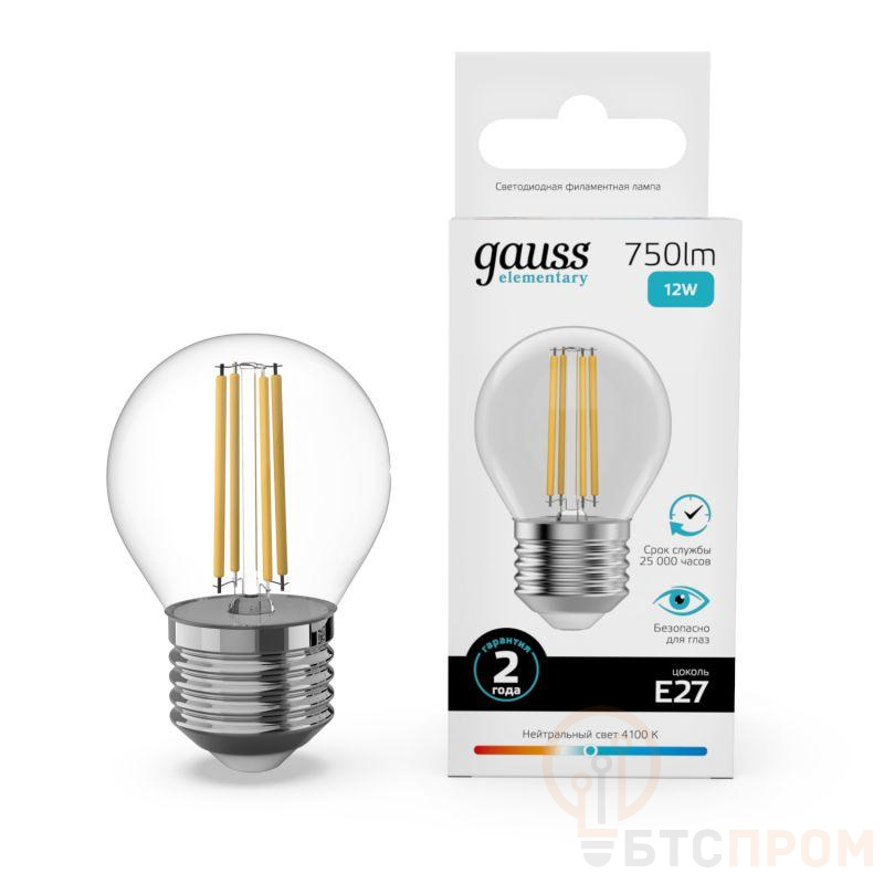 –Лампа светодиодная филаментная Filament Elementary 12Вт шар 4100К Е27 750лм GAUSS 52222