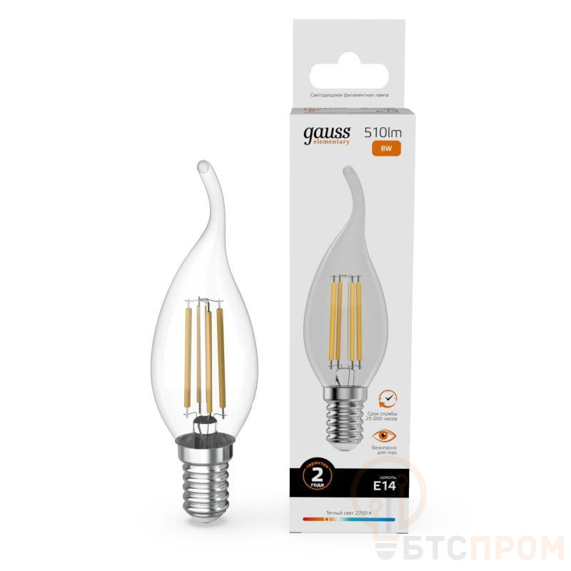 Лампа светодиодная филаментная Filament Elementary 8Вт свеча на ветру 2700К Е14 510лм GAUSS 42118 фото в каталоге от BTSprom.by