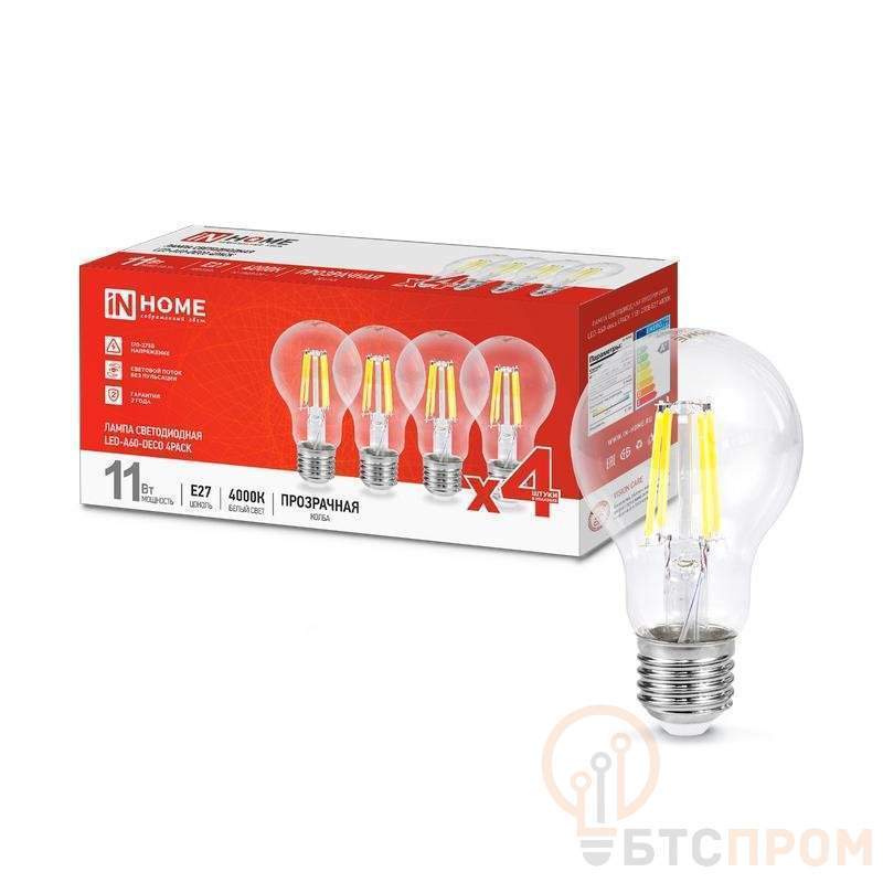 Лампа светодиодная LED-A60-deco 4PACK 11Вт прозрачная 230В E27 4000К 1160лм (уп.4шт) IN HOME 4690612053417
