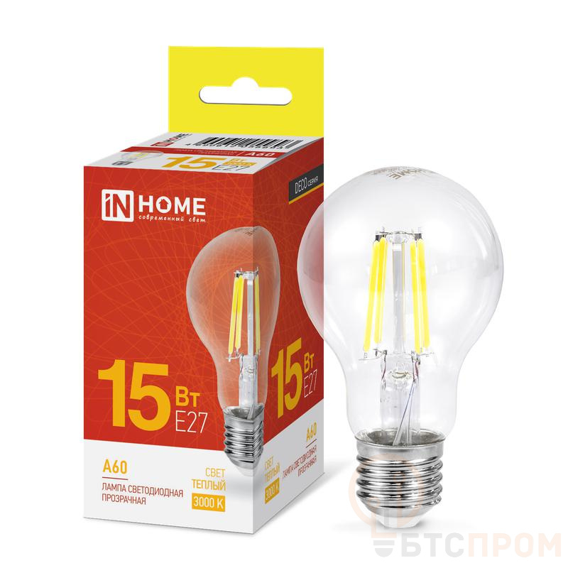 Филаментная лампа IN HOME LED-A60-deco 4690612055893 мощностью 15 Вт. Световой поток 1480 лм. Теплый белый свет (3000К). Лампа грушевидной формы с прозрачной колбой и цоколем E27. Напряжение 230В. Декоративный дизайн, подчеркивающий филаменты. Идеальна для интерьеров в стиле лофт, ретро.