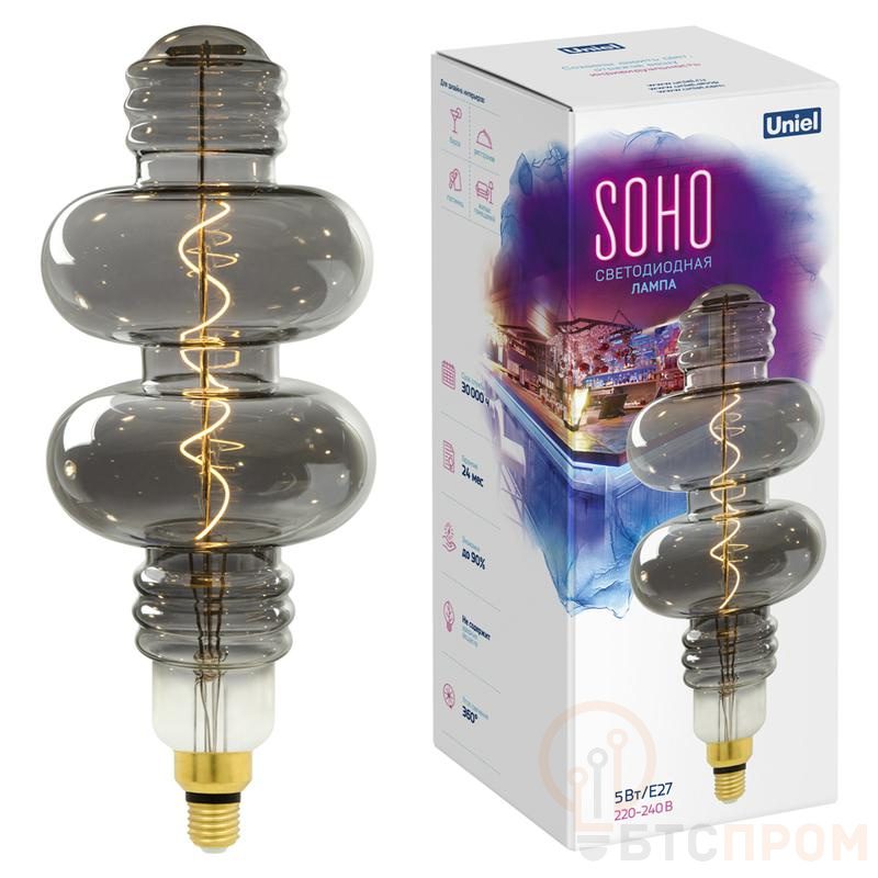 Лампа светодиодная филаментная LED-SF42-5W/SOHO/E27/CW CHROME/SMOKE GLS77CR SOHO спиральный филамент хром./дым. колба Uniel UL-00005922
